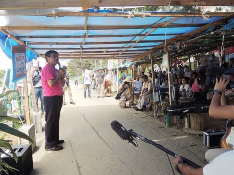 (10万票の大差で当選した伊波洋一さんが高江に来られた。皆からの大きな拍手が湧き上がる)