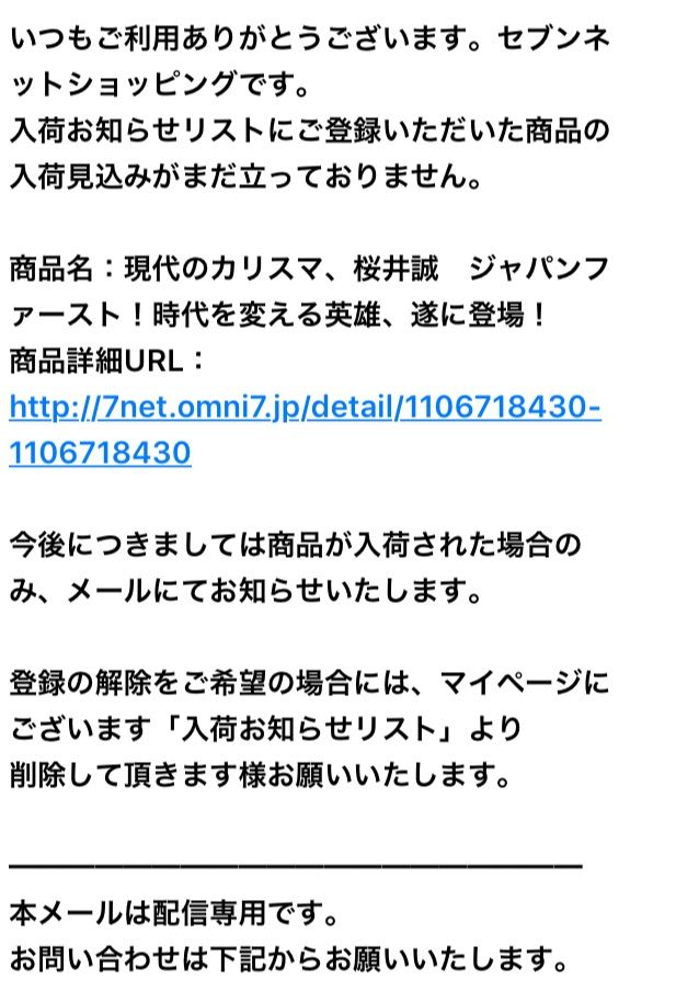 入荷お知らせリストにご登録いただいた商品の入荷見込みがまだ立っておりません。