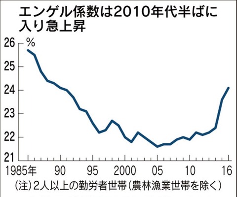 確かに2005年を谷にしてエンゲル係数は上昇しています、特に2014年からの上昇はかなりの角度です。つまり、消費税のアップが原因だと思います。