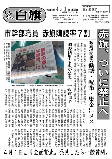 福岡県行橋市の庁舎内で、日本共産党の政党機関紙「しんぶん赤旗」の勧誘や配付、集金が行われているとの指摘を受けて、市が行った調査で、平成26年9月時点で管理職の約7割が購読していたことが7日、同市議会の小坪慎也議員の追及で明らかになりました。市では、庁舎内での勧誘行為などを禁止する方針を固めました。