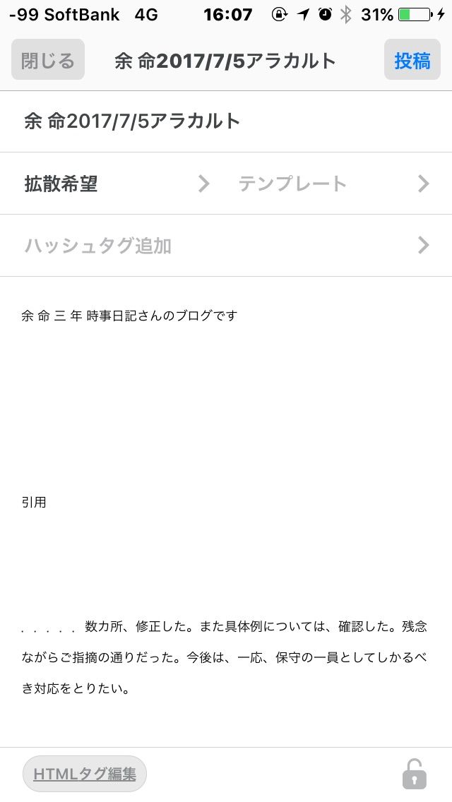 余命三年時事日記を余 命 三 年 時事日記と変え、「共謀罪施行」よフレーズを消したら投稿できました。共謀罪施行は禁句なのでしょう。笑笑。