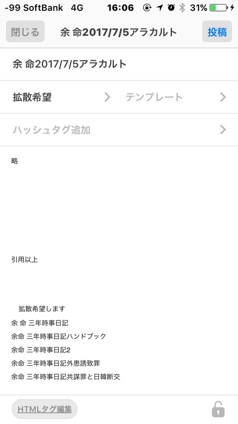 余命三年時事日記を余 命 三 年 時事日記と変え、「共謀罪施行」よフレーズを消したら投稿できました。共謀罪施行は禁句なのでしょう。笑笑。